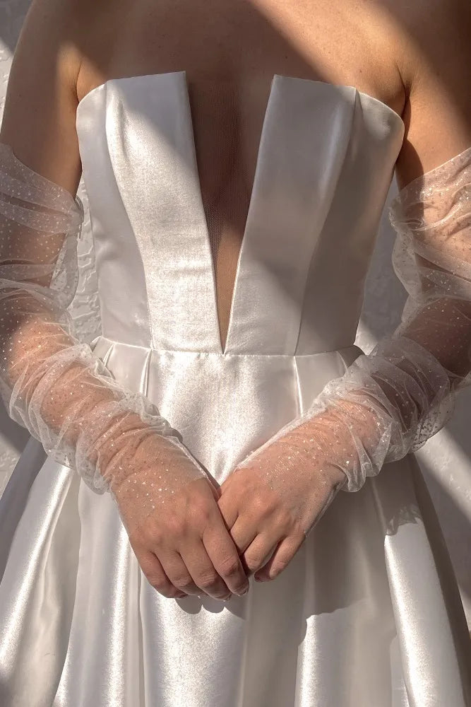 The Made With Love Sparkle Sleeves are crafted from soft tulle with delicate glitter throughout, adding a subtle touch of radiance and glamour to any bridal gown. Designed to elevate your look, these sparkling sleeves provide just the right amount of shimmer, perfect for brides seeking an effortlessly enchanting and luminous finish on their wedding day.