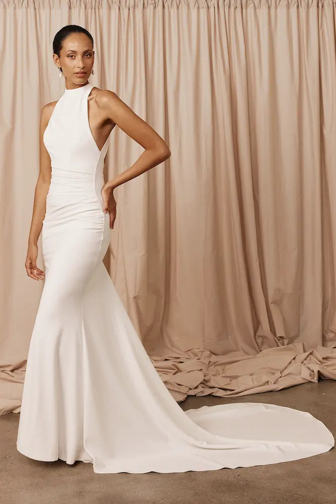 Lauren, available at Marrime, is a high-neck wedding dress that brings a clean, modern look in off-white stretch crepe, with built-in structure for a smooth, supported fit.