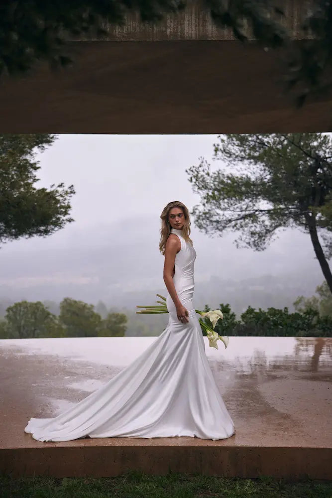 The Eva Lendel Ricci wedding dress is a mermaid-style wedding dress made from smooth satin, designed to gently follow the natural silhouette. The bodice features soft draping for a subtle touch of texture, while the open-back design adds modern interest. A concealed zipper ensures a neat and seamless finish.