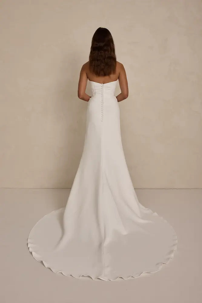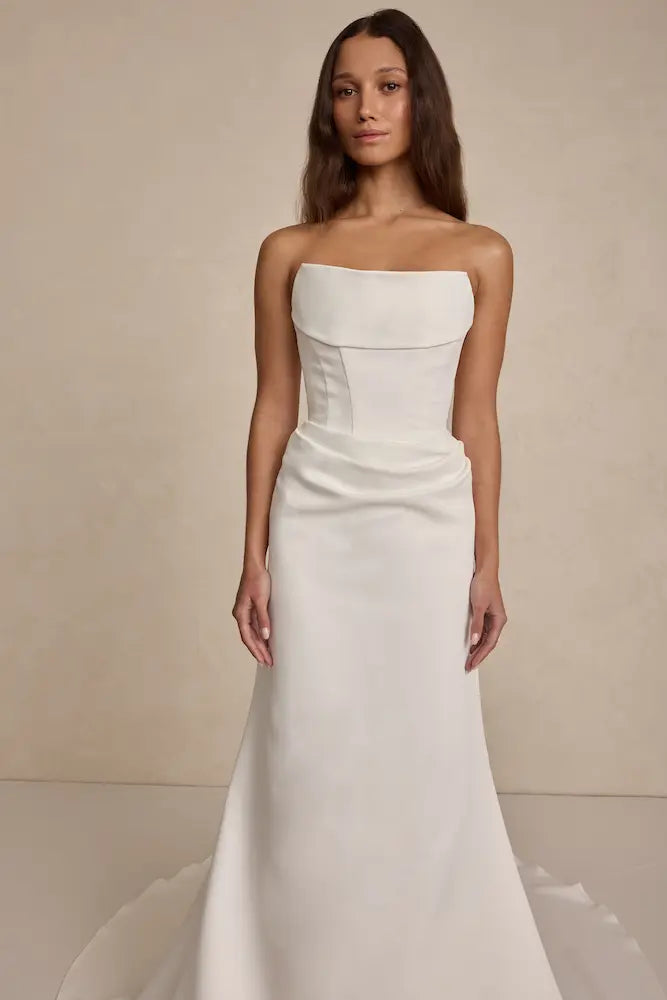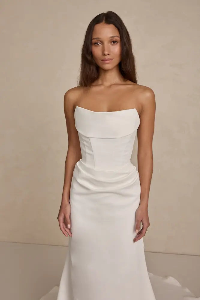 Elegant and architectural, the Made With Love Knox wedding dress is a modern interpretation of timeless sophistication. Inspired by Made With Love's iconic Celine dress, Knox features a newly developed bodice pattern with internal boning for structure and support, creating a refined and flattering silhouette. A soft, sculptural cowl detail at the front adds a touch of contemporary romance, perfect for brides seeking understated elegance with a modern twist.