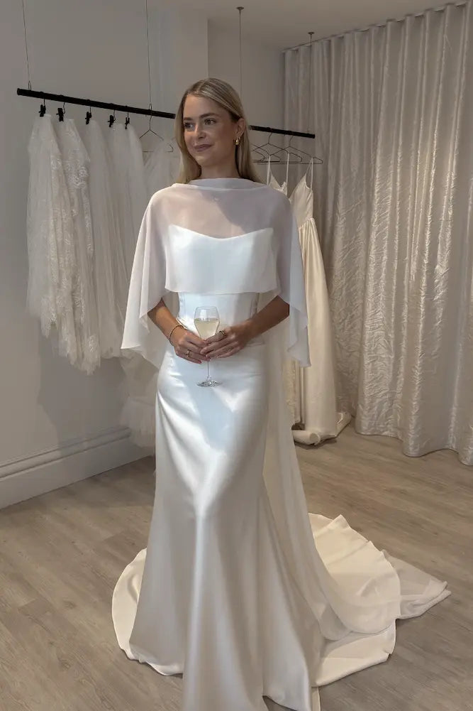 Crafted in MWL’s Brooks satin, Natalie has a soft cream hue with a subtle texture, giving the gown a clean finish that feels modern and elevated.