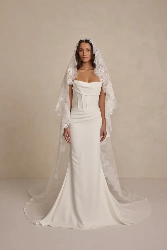Framed with the intricately designed Alice trim, Fleur’s scalloped lace edges add a touch of vintage-inspired artistry. The detailed finish accentuates the veil’s flowing silhouette, creating a dreamy, romantic aesthetic from every angle. Whether paired with a minimalist crepe gown or a gown rich in lace detailing, the Fleur Veil is designed to elevate and complement your bridal ensemble with ease.