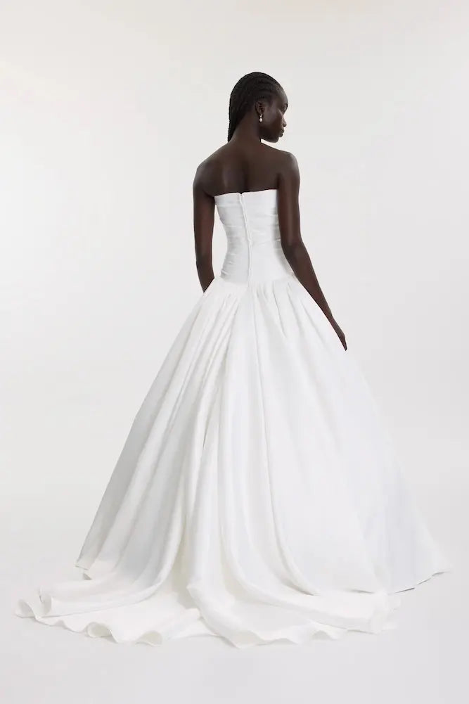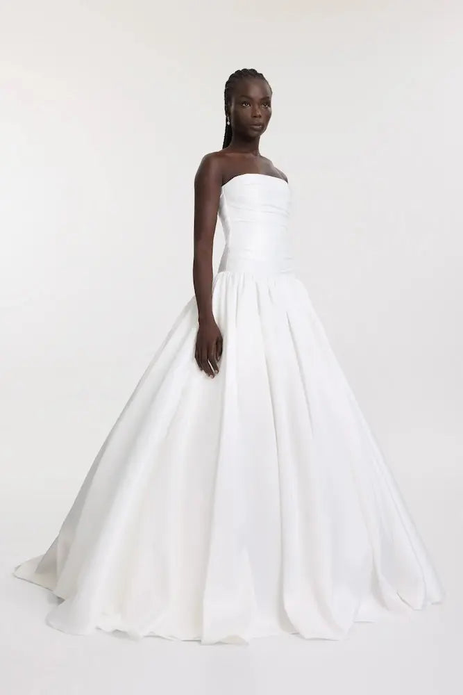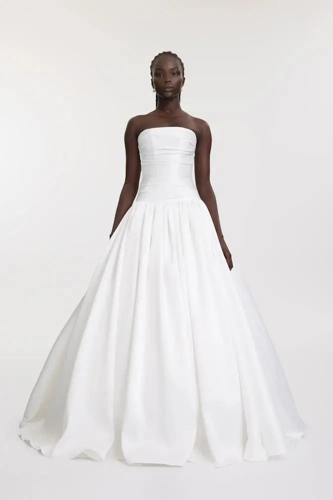 Lucky by KYHA Bride is the gown for the bride who dares to make a statement. Designed with modern couture drama and a nod to bold eighties influences, Lucky features a sculpted, structured bodice with a draped drop waist that flows into a voluminous, gathered skirt. Crafted from luxurious duchess satin, this gown embodies striking sophistication while offering a timeless yet fashion-forward edge.