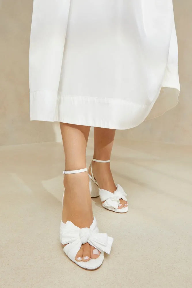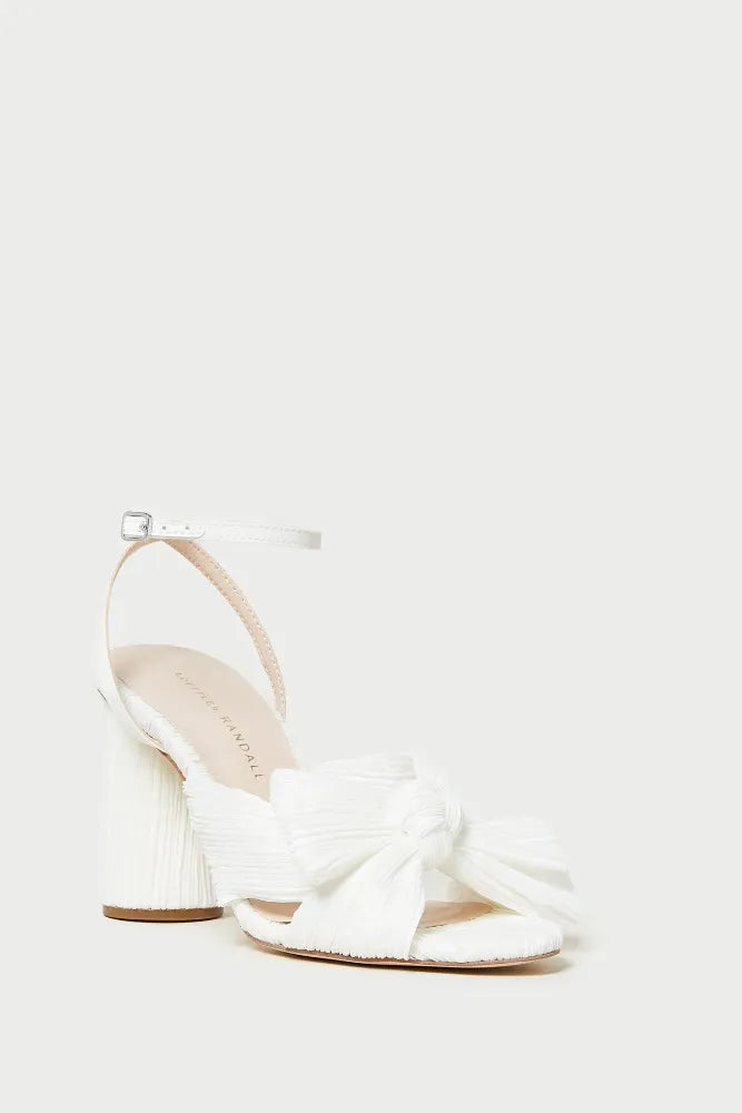Regular price £180.00Loeffler Randall Camellia pleated knot heeled sandal in white fabric. Padded footbed with gold stamped logo. Open toe with adjustable buckle ankle strap.